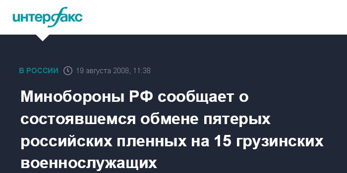Москва. 19 августа. INTERFAX.RU - Пятнадцать грузинских военнослужащих были обменяны во вторник в Горийском районе Грузии на пять российских пленных, в том числе двух летчиков сбитых ранее самолетов, сообщил агентству "Интерфакс-АВН" помощник главкома Сухопутных войск РФ полковник Игорь Конашенков.