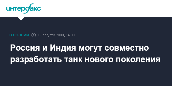 Москва. 19 августа. INTERFAX.RU - Россия и Индия обсуждают возможность совместной разработки танка нового поколения, сообщил журналистам старший инспектор Организации оборонных исследований и развития министерства обороны Индии Сиватхану Пиллаи.