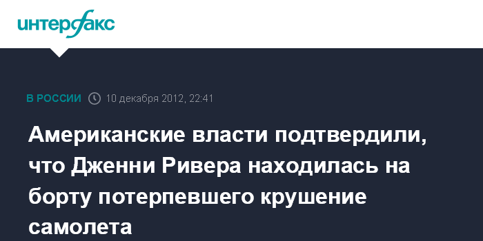 Вашингтон. 10 декабря. INTERFAX.RU - На борту частного самолета, который потерпел крушение в минувшее воскресенье на севере Мексики, действительно находилась знаменитая американская певица мексиканского происхождения Дженни Ривера, заявили в понедельник в Федеральном агентстве транспортной безопасности США.
