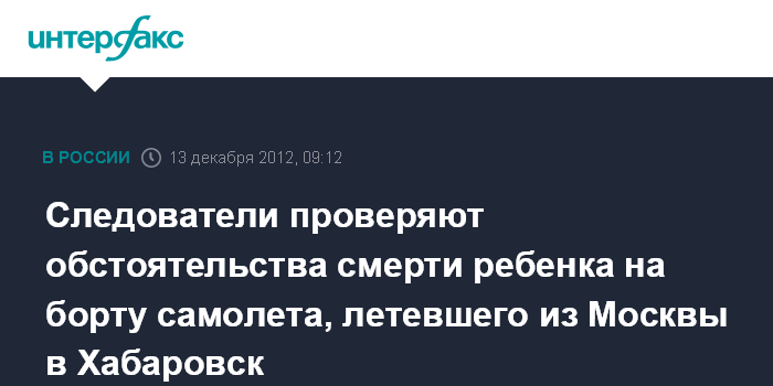 Новосибирск. 13 декабря. INTERFAX.RU - Пятилетний ребенок скончался утром в четверг на борту самолета Боинг-777, выполнявшего рейс по маршруту Москва - Хабаровск, сообщает Западно-Сибирское следственное управление на транспорте.
