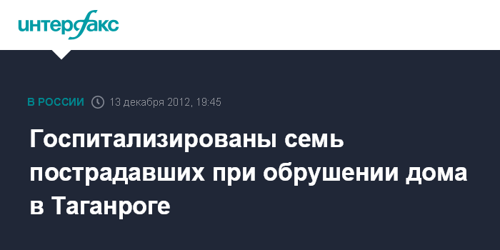 Ростов-на-Дону. 13 декабря. INTERFAX.RU - Из-под завалов обрушившегося в Таганроге дома извлечены в общей сложности 13 человек, один из которых погиб, сообщил агентству "Интерфакс-Юг" официальный представитель Южного регионального центра МЧС России. "Из обрушившегося дома извлечены 13 человек, один из которых погиб, из двенадцати семеро госпитализированы", - сказал представитель ЮРЦ МЧС России.
