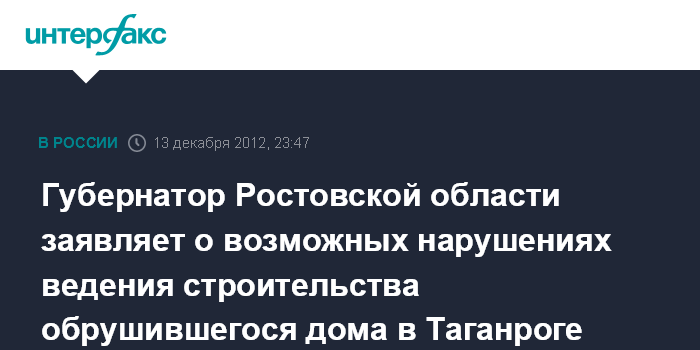 Ростов-на-Дону. 13 декабря. INTERFAX.RU - При строительстве обрушившегося в Таганроге дома, где погибли люди, могли быть допущены нарушения, сообщил агентству "Интерфакс" руководитель пресс-службы губернатора Ростовской области Ирина Четвертакова со ссылкой на губернатора.