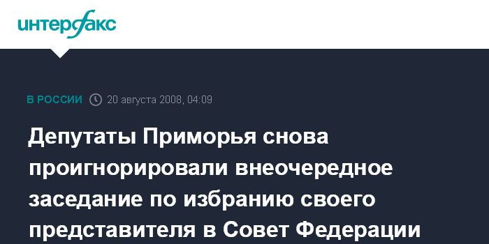 Владивосток. 20 августа. ИНТЕРФАКС-ДАЛЬНИЙ ВОСТОК - В среду в третий раз из-за отсутствия кворума не состоялось внеочередное заседание Законодательного собрания (ЗакС) Приморья, на котором депутаты должны были избрать своего представителя в верхнюю палату российского парламента.