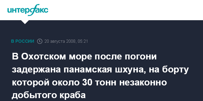 Петропавловск-Камчатский. 20 августа. ИНТЕРФАКС-ДАЛЬНИЙ ВОСТОК - Камчатские пограничники за незаконный лов краба в Охотском море задержали шхуну "Аделаид", шедшую под флагом Панамы.