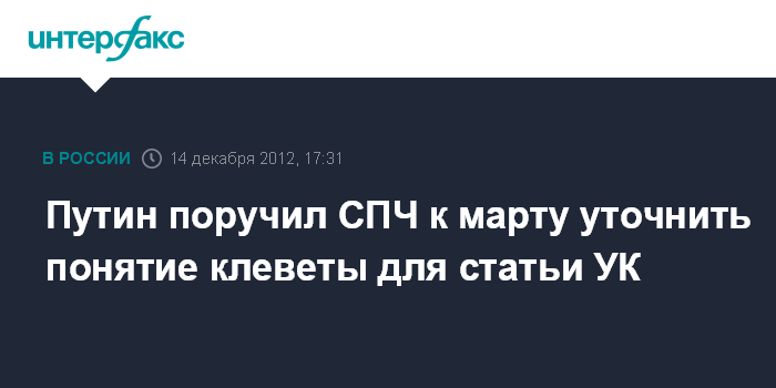 "Совету при президенте РФ по развитию гражданского общества и правам человека: представить предложения по внесению изменений в статью 128.1 Уголовного кодекса РФ в части уточнения понятия клеветы", - говорится в перечне поручений Путина по итогам заседания Совета при президенте по развитию гражданского общества и правам человека.