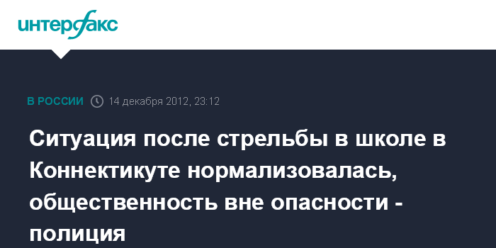 Вашингтон. 14 декабря. INTERFAX.RU - Ситуация в Ньютауне (штат Коннектикут, США), где в результате стрельбы в школе "Сэнди Хук" погибли 18 детей и девять взрослых, нормализовалась, общественность вне опасности, сообщил на пресс-конференции в пятницу представитель полиции Ньютауна.