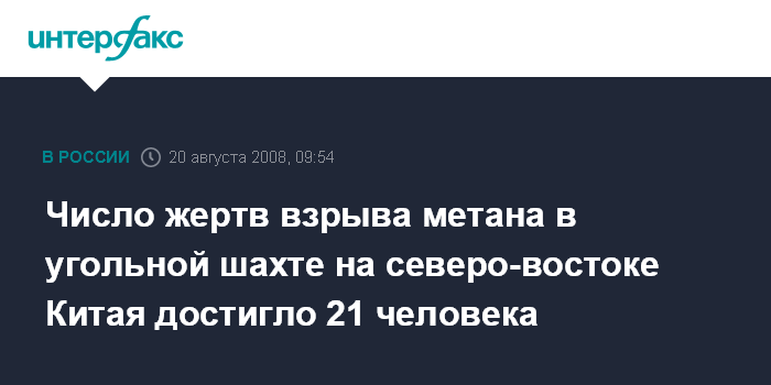 Москва. 20 августа. INTERFAX.RU - Число горняков, погибших в результате взрыва метана в угольной шахте в северо-восточной китайской провинции Ляонин достигло 21 человека, еще четыре человека числятся пропавшими без вести, сообщили местные власти.