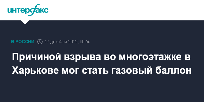 Киев. 17 декабря. INTERFAX.RU - По предварительным данным, причиной взрыва в 16-этажном доме в Харькове на Московском проспекте в воскресенье вечером стал газовый баллон.