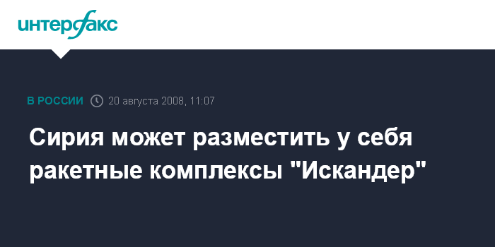 Москва. 20 августа. INTERFAX.RU - Президент Сирии Башар Асад заявляет о поддержке России в конфликте с Грузией и сообщает, что Дамаск в принципе готов рассмотреть вопрос о размещении на своей территории российских ракетных комплексов "Искандер" в ответ на размещение элементов американской ПРО в Европе.