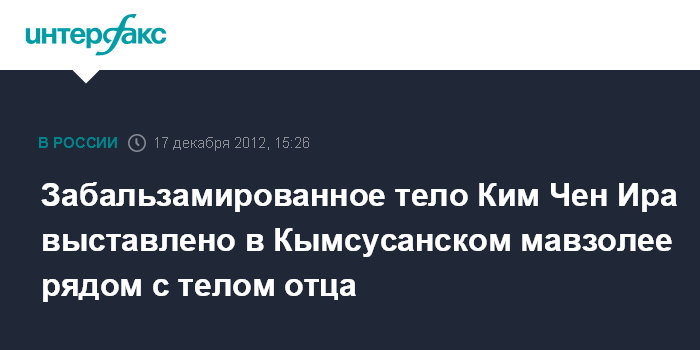 Сеул. 17 декабря. INTERFAX.RU - Забальзамированное тело прежнего руководителя КНДР Ким Чен Ира в день первой годовщины его смерти помещено в постоянный саркофаг в Кымсусанском мемориальном дворце, где также покоится тело его отца - основателя КНДР и вечного президента страны Ким Ир Сена.