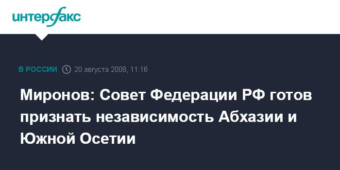 Москва. 20 августа. INTERFAX.RU - Председатель Совета Федерации Сергей Миронов заявляет, что верхняя палата российского парламента готова признать независимость Южной Осетии и Абхазии, если на то будет воля народов этих республик.