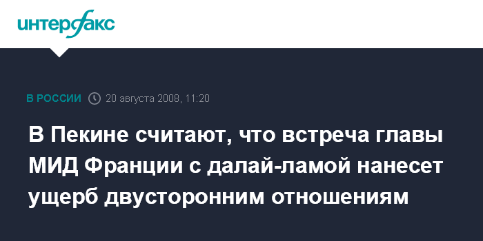 Москва. 20 августа. INTERFAX.RU - Китай рассчитывает на то, что Франция будет учитывать отношение Китая к далай-ламе и не допустит действий, которые повредят отношениям между двумя странами, заявил официальный представитель МИД КНР Цинь Ган в среду на брифинге в Пекине.