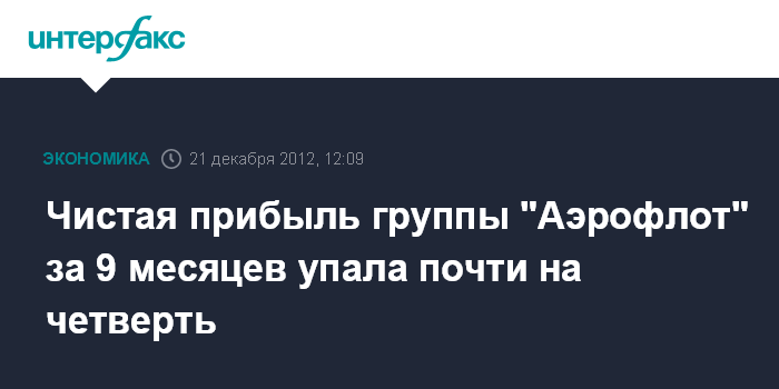 Москва. 21 декабря. INTERFAX>RU - Чистая прибыль группы "Аэрофлот" по МСФО за 9 месяцев 2012 г. сократилась на 22,8% и составила $296,2 млн, говорится в отчете компании.