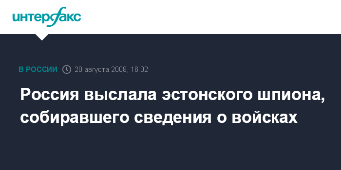 Москва. 20 августа. INTERFAX.RU - Правоохранительные органы России выслали из страны занимавшегося разведывательной деятельностью гражданина Эстонии, сообщил "Интерфаксу" в среду источник в силовых структурах Петербурга.