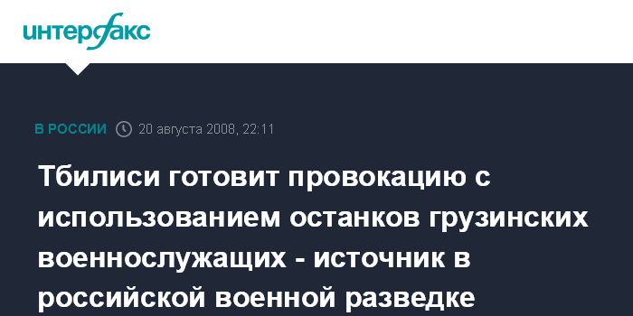 Представитель военной разведки отметил еще два обстоятельства. Первое, по его словам, грузинская сторона практически не производила захоронений погибших, что может говорить о возможности подготовки провокации. Кроме того, отметил он, российскими миротворцами и югоосетинскими властями за эти дни переданы грузинской стороне многочисленные останки грузинских военнослужащих.
