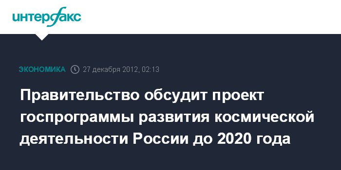 Москва. 27 декабря. ИНТЕРФАКС - Проект государственной программы "Космическая деятельность России" выносится в четверг на обсуждение правительства РФ.