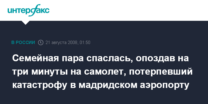 Мадрид. 20 августа. ИНТЕРФАКС - Испанская пара, которая в среду должна была лететь самолетом испанской авиакомпании "Спанэйр", который потерпел катастрофу в мадридском аэропорту "Барахас", спаслась лишь потому, что опоздала на рейс всего на три минуты, сообщает телевизионная служба испанского агентства ЭФЭ.