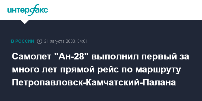 Петропавловск-Камчатский. 21 августа. ИНТЕРФАКС-ДАЛЬНИЙ ВОСТОК - Самолет "Ан-28" Корякского авиапредприятия выполнил первый прямой рейс по маршруту Петропавловск-Камчатский-Палана.