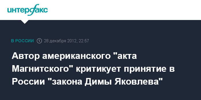 Вашингтон. 28 декабря. INTERFAX.RU - Автор принятого в США "акта Магнитского" сенатор Бенджамин Кардин подверг резкой критике принятие в России "закона Димы Яковлева". "Наказывать невинных детей из сиротских приютов в рамках российской внешней политики - это вводит в замешательство", - написал сенатор в пятницу в своем микроблоге в "Твиттере".
