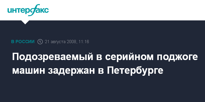 Москва. 21 августа. INTERFAX.RU – Угрозыск милиции Петербурга задержал подозреваемого в поджоге нескольких автомобилей во Фрунзенском районе во вторник, сообщает пресс-служба ГУВД Петербурга и Ленинградской области.
