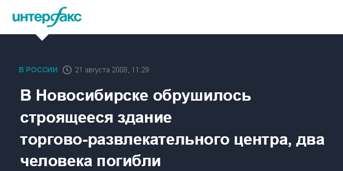Москва. 21 августа. INTERFAX.RU – Два человека погибли и два пострадали в результате обрушения в строящемся торгово-развлекательном центре в Калининском районе Новосибирска.