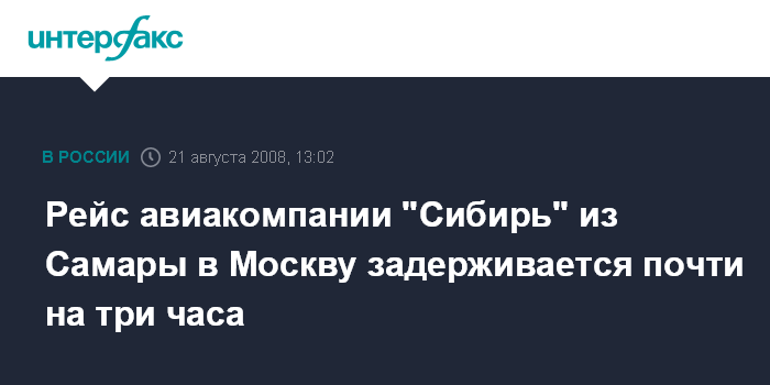 Москва. 21 августа. INTERFAX.RU - Самарские пассажиры почти три часа не могут вылетать из аэропорта "Курумоч" в Москву из-за задержки рейса №34 в Домодедово авиакомпании "Сибирь".