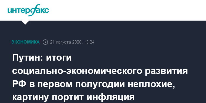 Москва. 21 августа. INTERFAX.RU - Премьер-министр РФ Владимир Путин оценивает итоги социально-экономического развития в первом полугодии 2008 года как "очень неплохие". "В целом - очень неплохо: рост ВВП составил 8%, инвестиции увеличились на 16,9%, стабильно растут заработная плата - на 13% и реальные доходы населения - 8,1%", - заявил Путин на заседании правительства РФ, добавив, что такую картину портит только ситуация с инфляцией.