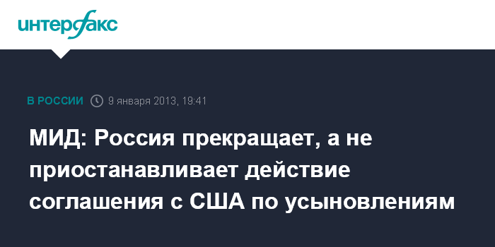 "МИД России официально передал Посольству США в Москве 1 января с.г. ноту с уведомлением о прекращении - а не о "приостановлении" - действия указанного Соглашения в связи со вступлением в силу с этой же даты Федерального Закона "О мерах воздействия на лиц, причастных к нарушению основополагающих прав и свобод человека, прав и свобод граждан Российской Федерации", - говорится в комментарии МИД РФ.