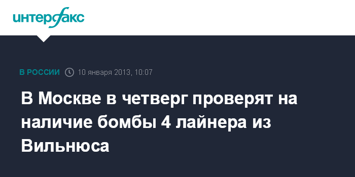 Москва. 10 января. INTERFAX.RU - Полиция досмотрит в столичных аэропортах четыре самолета, которые в течение дня будут прибывать в Москву из Вильнюса, из-за сообщения о возможном взрывном устройстве на борту одного из них, сообщил "Интерфаксу" источник в экстренных службах.
