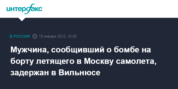 Москва/Вильнюс. 10 января. INTERFAX.RU - В Вильнюсе задержан мужчина, сообщивший анонимно в полицию о бомбе, якобы заложенной в самолете одного из рейсов в Москву, сообщил "Интерфаксу" источник в экстренных службах литовской столицы.