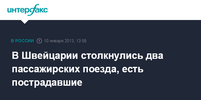 Берн. 10 января. INTERFAX.RU - Два пассажирских поезда столкнулись на севере Швейцарии, в 250 м от вокзала города Нойхаузен-ам-Райнфаль, есть пострадавшие, сообщили в местной полиции в четверг.