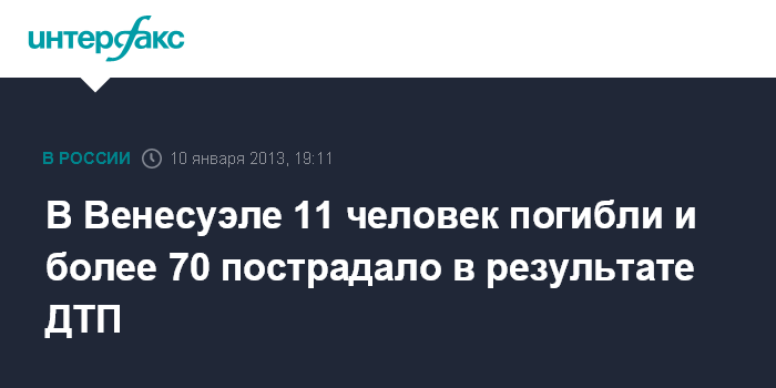 Каракас. 10 января. INTERFX.RU - По меньшей мере 11 человек погибли и еще 75 получили ранения после того, как несколько транспортных средств столкнулись на шоссе Лара-Сулия на северо-западе Венесуэлы, сообщает местный телеканал "Глобовисьон".