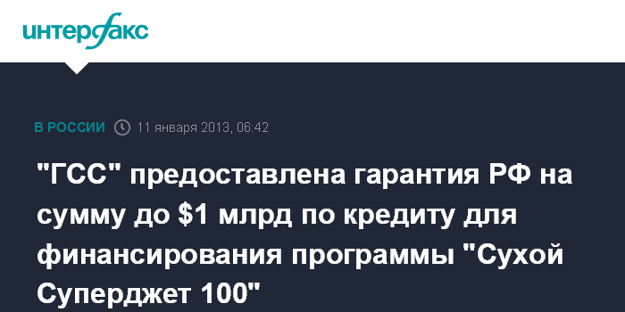 "ГСС" предоставлена гарантия РФ на сумму до $1 млрд по кредиту для финансирования программы "Сухой Суперджет 100"