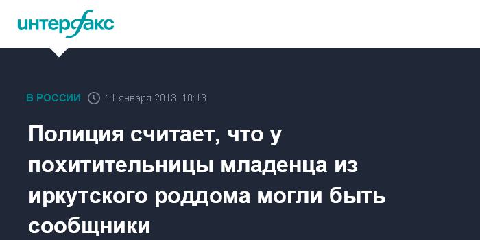 Иркутск. 11 января. INTERFAX.RU - Сотрудники управления МВД РФ по Иркутской области предполагают, что жительница Иркутска, задержанная за похищение новорожденного ребенка из Ивано-Матренинской детской больницы, совершила преступление не в одиночку.