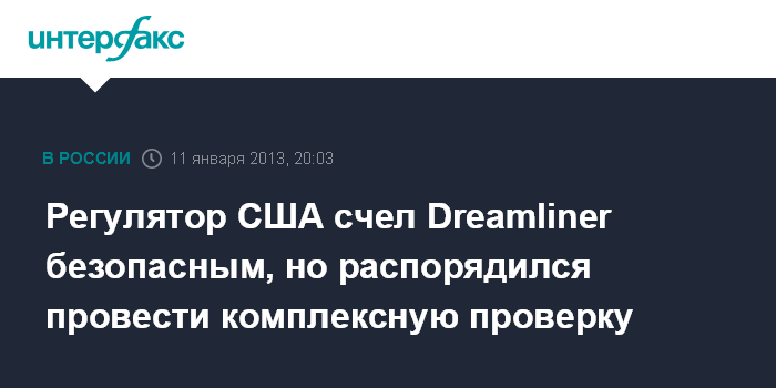 Вашингтон. 11 января. INTERFAX.RU - Федеральное управление гражданской авиации (FAA) США уверено в безопасности Boeing-787 Dreamliner, заявил в пятницу глава агентства Майкл Хуэрта.