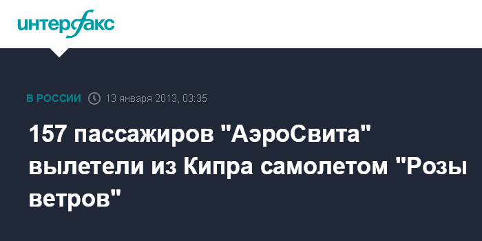 Киев. 13 января. ИНТЕРФАКС-УКРАИНА - Самолетом авиакомпании Windrose ("Роза ветров") был обеспечен вылет 157 пассажиров компании "АэроСвит" по маршруту Ларнака (Кипр) - Киев, из которых около 115 - граждане Украины.