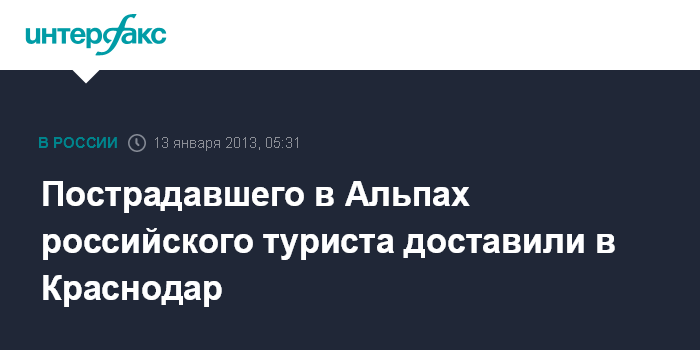 Краснодар. 13 января. ИНТЕРФАКС-ЮГ - Пострадавший во время аварии снегохода в Альпах житель Кубани доставлен в Краснодар, сообщили агентству "Интерфакс-Юг" в министерстве курортов и туризма Краснодарского края в воскресенье.