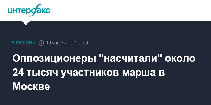 Москва. 13 января. INTERFAX.RU - Группа активистов оппозиции решила организовать свой подсчет численности участников шествия против "антимагнитского закона". По их данным, она превысила 20 тыс. человек. "Мы только что завершили подсчет. По нашим данным, около 24 тыс. человек сегодня приняло участие в акции", - заявил "Интерфаксу" активист Дмитрий Ионов.