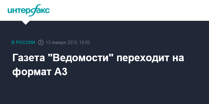 Москва. 13 января. INTERFAX.RU - Первый в 2013 году бумажный выпуск российской газеты "Ведомости" выйдет в понедельник, 14 января в новом формате. Дизайн издания не изменится, но "Ведомости" будут печататься в формате А3 - это половина от прежнего формата газеты А2. Соответственно, полос станет в два раза больше. При этом вместо двух нынешних "тетрадок" в издании будет одна.