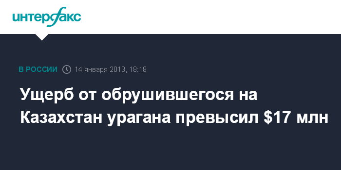 Тараз. 14 января. INTERFAX.RU - Подсчитана предварительная сумма ущерба от урагана, бушевавшего в Жамбылской области на юге Казахстана. Как отмечается в распространенном в понедельник сообщении пресс-службы акимата области, ущерб превысил 2,6 млрд тенге (150,92/$1).