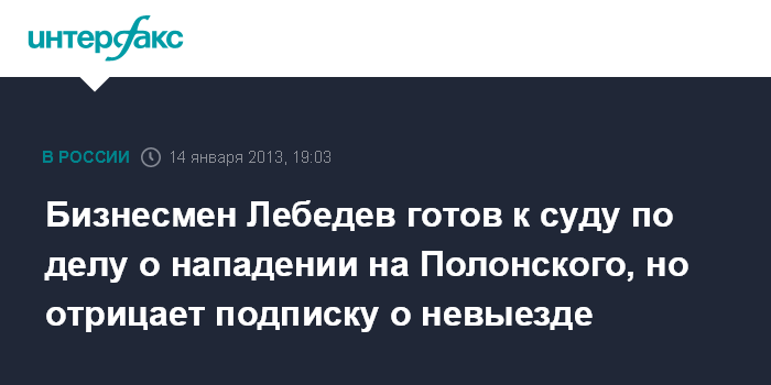 Бизнесмен Лебедев готов к суду по делу о нападении на Полонского, но отрицает подписку о невыезде