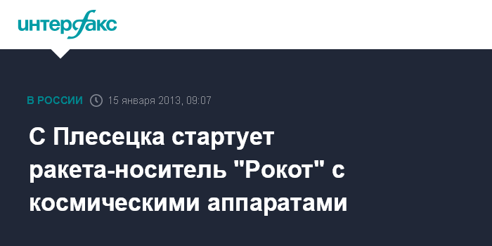 Москва. 15 января. INTERFAX.RU - Россия во вторник открывает космический 2013 г. запуском с космодрома Плесецк ракеты-носителя "Рокот" с космическими аппаратами, сообщил "Интерфаксу" официальный представитель Войск воздушно-космической обороны полковник Алексей Золотухин.