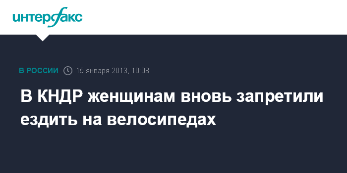 Сеул. 15 января. INTERFAX.RU Власти КНДР возобновили действие закона, запрещающего женщинам ездить на велосипедах, сообщает во вторник южнокорейский интернет-портал Daily HK, специализирующийся на сборе и анализе информации с Севера Корейского полуострова.