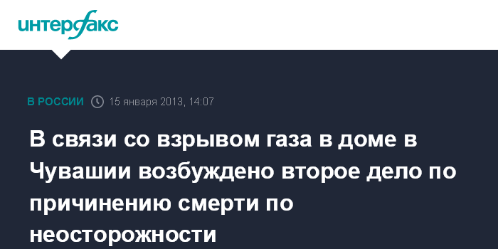"По факту взрыва возбуждено также уголовное дело по ч.3 ст.109 УК РФ (причинение смерти по неосторожности двум лицам)", - сообщил агентству "Интерфакс-Поволжье" старший помощник руководителя СУ СКР по Чувашии Олег Дмитриев.