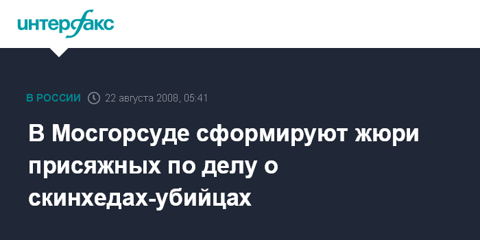 Москва. 22 августа. ИНТЕРФАКС - Мосгорсуд в пятницу сформирует коллегию присяжных по делу банды скинхедов во главе с Артуром Рыно и Павлом Скачевским, членов которой обвиняют в совершении 20 убийств и 12 покушений на убийство.