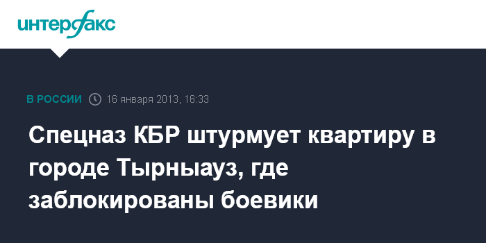 Москва. 16 января. INTERFAX.RU - Национальный антитеррористический комитет (НАК) сообщает о начале штурма квартиры в Тырныаузе, где укрываются боевики.