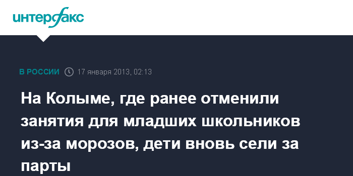 Магадан.17 января. ИНТЕРФАКС-ДАЛЬНИЙ ВОСТОК- Комитет по образованию администрации Сусуманского района Колымы утром в четверг принял решение возобновить занятия для младших школьников, ранее отмененные из-за сильных морозов.