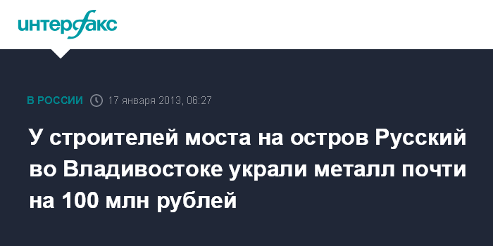 Владивосток. 17 января. ИНТЕРФАКС-ДАЛЬНИЙ ВОСТОК - Полицейские Приморья раскрыли хищение металла почти на 100 млн рублей у компании, строившей мост на остров Русский к саммиту АТЭС-2012 во Владивостоке.