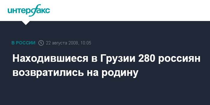 "Российские пограничники в течение сегодняшнего вечера приняли 280 граждан России, которые возвращались из Грузии на родину", - сообщил агентству "Интерфакс" руководитель пресс-службы Пограничного управления ФСБ РФ по Северной Осетии подполковник Александр Солод. Он отметил, что многие из прибывших россиян прибыли в Грузию на отдых, в гости к родственникам, либо находились в служебных поездках. Поскольку они пребывали на территории Грузии длительное время, то не имели средств к существованию.