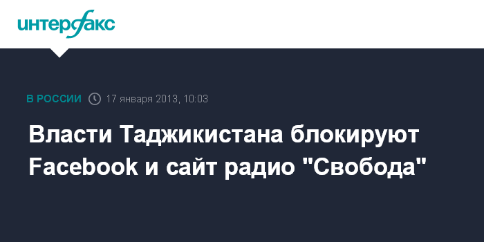 Душанбе. 17 января. INTERFAX.RU - Служба связи при правительстве Таджикистана в четверг распорядилась заблокировать доступ к четырем интернет-ресурсам, среди который социальная сеть Facebook и таджикская служба радио Liberty ("Свобода", тадж. "Озоди"), сообщили "Интерфаксу" представители компаний-провайдеров.